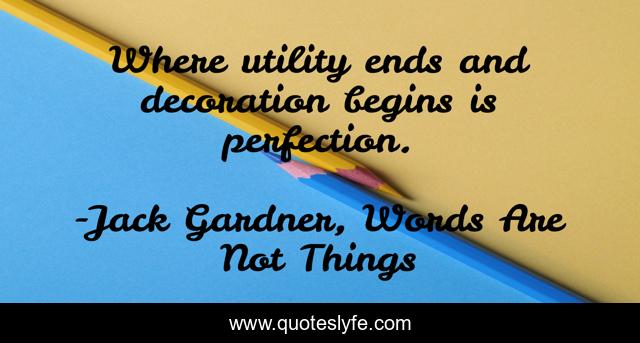 This page presents the quote "Where utility ends and decoration begins is perfection.". Author of this quote is Jack Gardner, Words Are Not Things. This quote is about decoration, art, perfection, utility,.