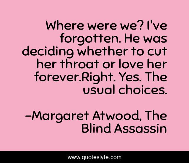 This page presents the quote "Where were we? I've forgotten. He was deciding whether to cut her throat or love her forever.Right. Yes. The usual choices.". Author of this quote is Margaret Atwood, The Blind Assassin. This quote is about love, affection, choices,.