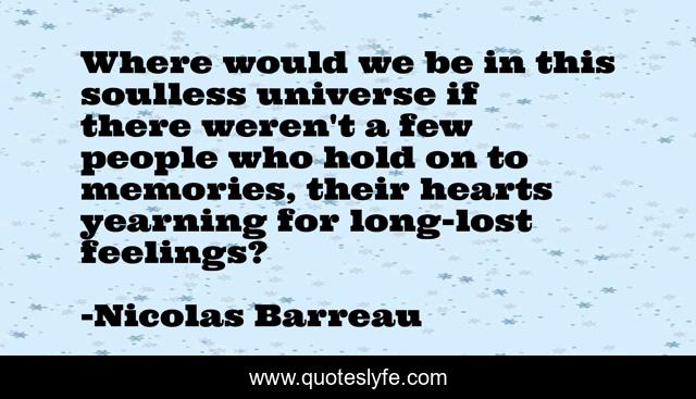 This page presents the quote "Where would we be in this soulless universe if there weren't a few people who hold on to memories, their hearts yearning for long-lost feelings?". Author of this quote is Nicolas Barreau. This quote is about memories, feelings,.