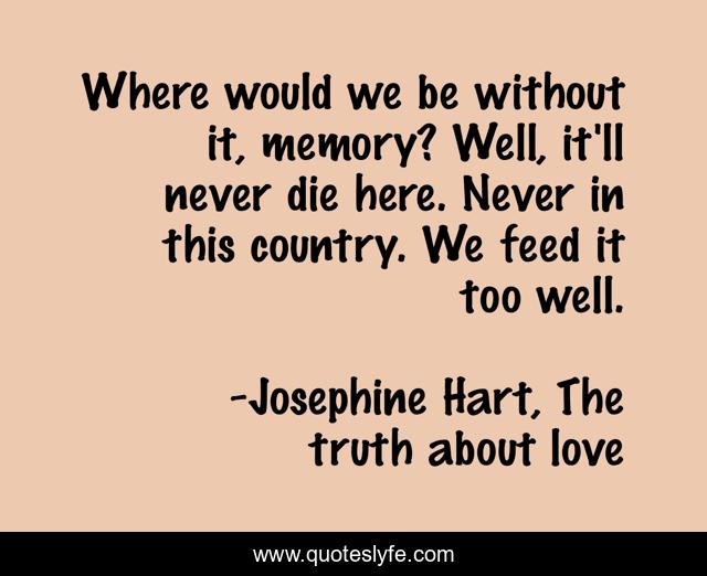 This page presents the quote "Where would we be without it, memory? Well, it'll never die here. Never in this country. We feed it too well.". Author of this quote is Josephine Hart, The truth about love. This quote is about past, memory, profound,.