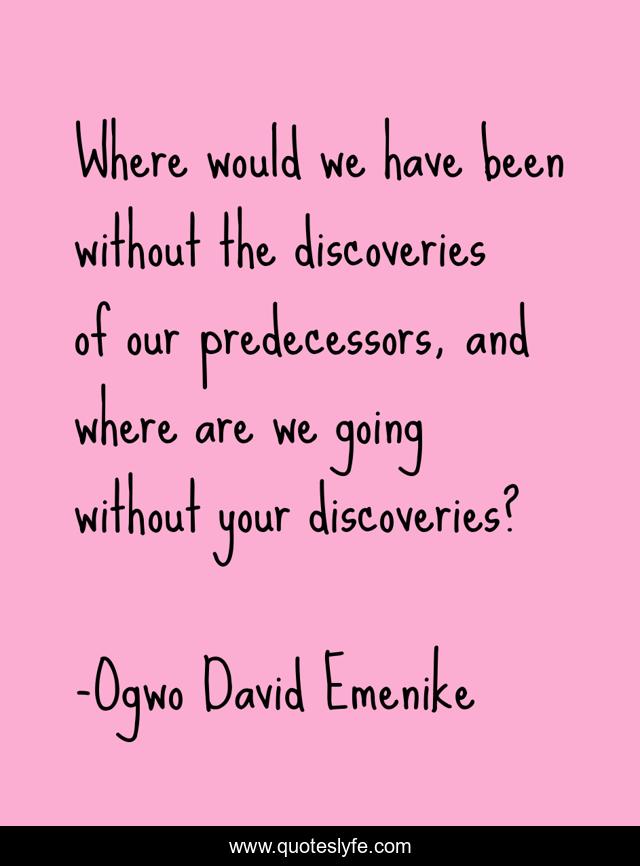 This page presents the quote "Where would we have been without the discoveries of our predecessors, and where are we going without your discoveries?". Author of this quote is Ogwo David Emenike. This quote is about self-acceptance, motivation, discovery, inspiration,.