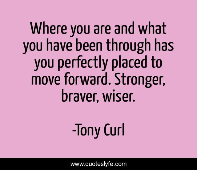This page presents the quote "Where you are and what you have been through has you perfectly placed to move forward. Stronger, braver, wiser.". Author of this quote is Tony Curl. This quote is about life, strength, inspiration, bravery, wisdom,.