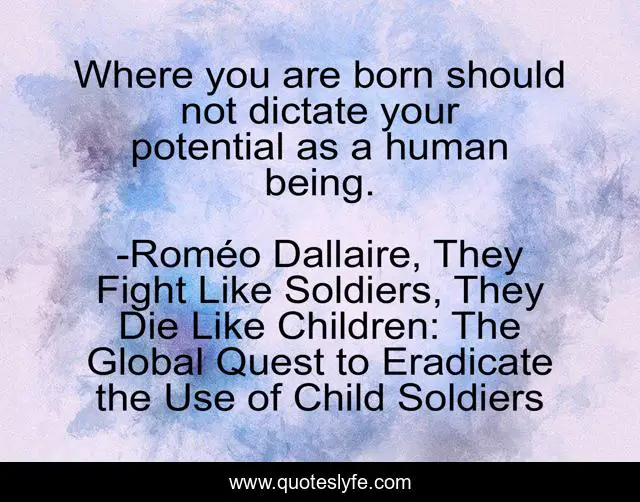 This page presents the quote "Where you are born should not dictate your potential as a human being.". Author of this quote is Roméo Dallaire, They Fight Like Soldiers, They Die Like Children: The Global Quest to Eradicate the Use of Child Soldiers. This quote is about justice, enthusiasm, humanity, inspirational, war,.