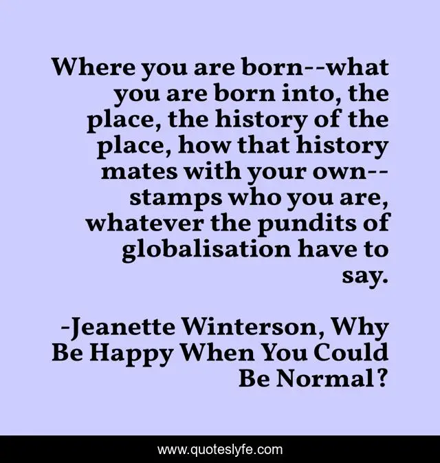 "Jeanette Winterson, Why Be Happy When You Could Be Normal? Quotes." Quoteslyfe.com, 2025. Fri. 05 Dec. 2025. <https://www.quoteslyfe.com/quote/Where-you-are-born-what-you-are-182496>.