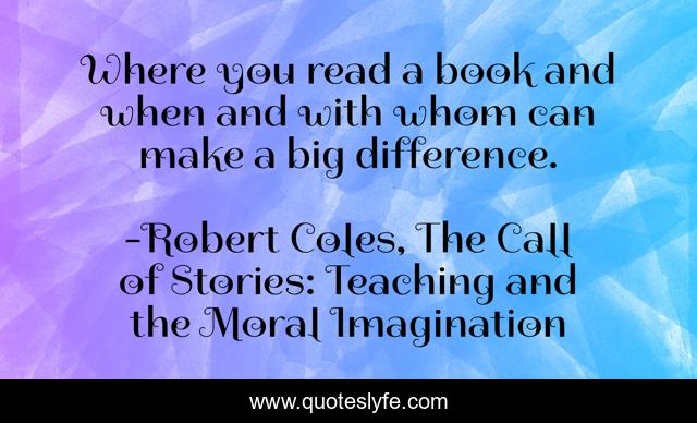 This page presents the quote "Where you read a book and when and with whom can make a big difference.". Author of this quote is Robert Coles, The Call of Stories: Teaching and the Moral Imagination. This quote is about meaning, story, value,.