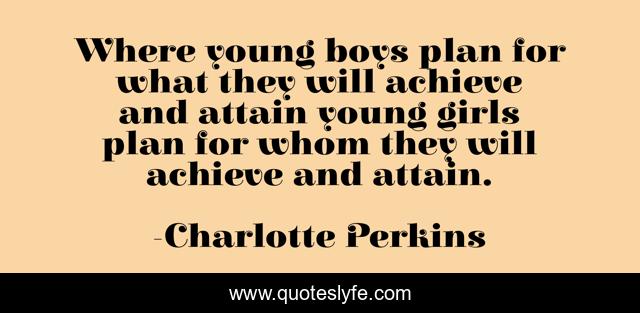 This page presents the quote "Where young boys plan for what they will achieve and attain young girls plan for whom they will achieve and attain.". Author of this quote is Charlotte Perkins. .