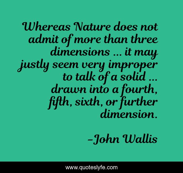 This page presents the quote "Whereas Nature does not admit of more than three dimensions ... it may justly seem very improper to talk of a solid ... drawn into a fourth, fifth, sixth, or further dimension.". Author of this quote is John Wallis. This quote is about calculus, dimensions, space, mathematician, science, nature, infinitesimal-calculus, scientist, mathematics,.