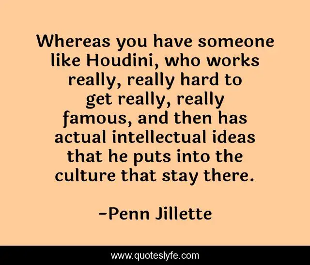 This page presents the quote "Whereas you have someone like Houdini, who works really, really hard to get really, really famous, and then has actual intellectual ideas that he puts into the culture that stay there.". Author of this quote is Penn Jillette. This quote is about culture, ideas,.