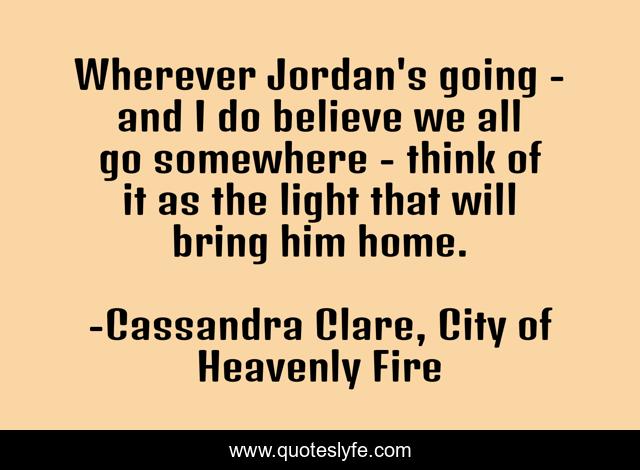 This page presents the quote "Wherever Jordan's going - and I do believe we all go somewhere - think of it as the light that will bring him home.". Author of this quote is Cassandra Clare, City of Heavenly Fire. This quote is about bat, death, somewhere, afterlife, sadness, heaven, maia, jordan-kyle, pg-228,.