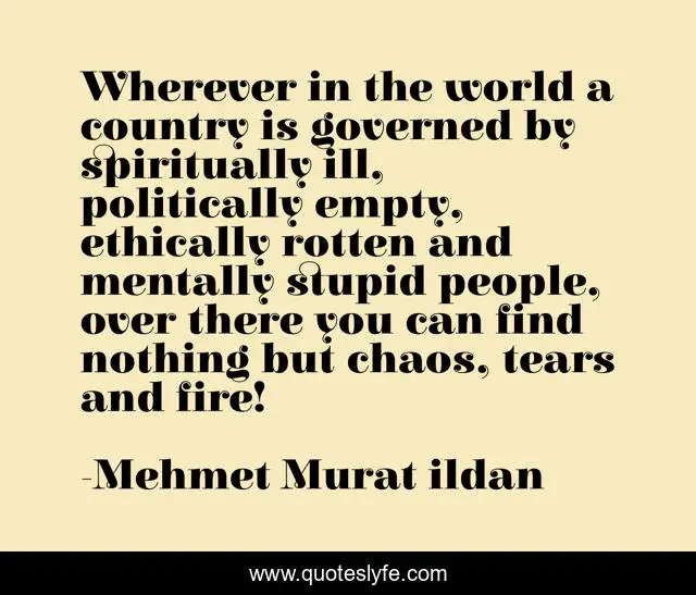 This page presents the quote "Wherever in the world a country is governed by spiritually ill, politically empty, ethically rotten and mentally stupid people, over there you can find nothing but chaos, tears and fire!". Author of this quote is Mehmet Murat ildan. This quote is about mentally-ill, governments, murat-ildan, fire, ethically, rotten, governed, chaos, tears,.