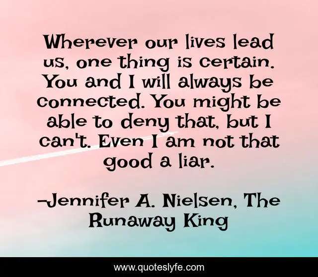 This page presents the quote "Wherever our lives lead us, one thing is certain. You and I will always be connected. You might be able to deny that, but I can't. Even I am not that good a liar.". Author of this quote is Jennifer A. Nielsen, The Runaway King. This quote is about sage, imogen,.