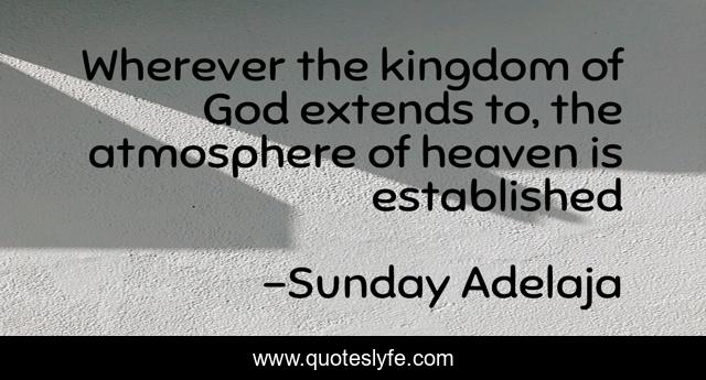 This page presents the quote "Wherever the kingdom of God extends to, the atmosphere of heaven is established". Author of this quote is Sunday Adelaja. This quote is about kingdom, established, atmosphere, heaven, god, extends,.