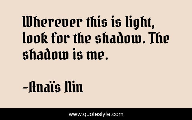This page presents the quote "Wherever this is light, look for the shadow. The shadow is me.". Author of this quote is Anaïs Nin. This quote is about dark, shadows, shadow, inspirational, enthusiasm,.