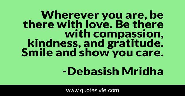 This page presents the quote "Wherever you are, be there with love. Be there with compassion, kindness, and gratitude. Smile and show you care.". Author of this quote is Debasish Mridha. This quote is about gratitude, debasish, love, affection, compassion, mrihda, philosophy, debasish-mridha, wherever,.