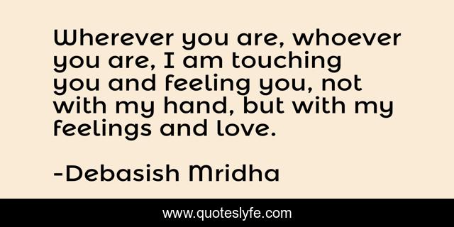This page presents the quote "Wherever you are, whoever you are, I am touching you and feeling you, not with my hand, but with my feelings and love.". Author of this quote is Debasish Mridha. This quote is about life, love, knowledge, inspirational, intelligence, philosophy, wisdom, quotes, affection,.