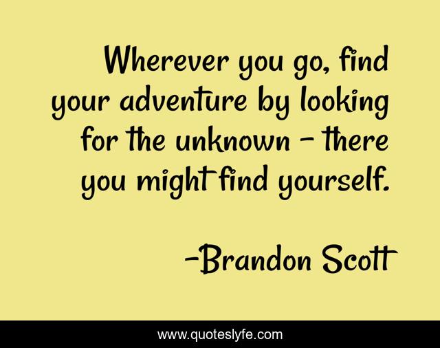 This page presents the quote "Wherever you go, find your adventure by looking for the unknown - there you might find yourself.". Author of this quote is Brandon Scott. This quote is about enthusiasm, adventure, inspirational,.