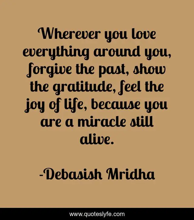 This page presents the quote "Wherever you love everything around you, forgive the past, show the gratitude, feel the joy of life, because you are a miracle still alive.". Author of this quote is Debasish Mridha. This quote is about life, love, knowledge, inspirational, intelligence, philosophy, wisdom, quotes, affection,.