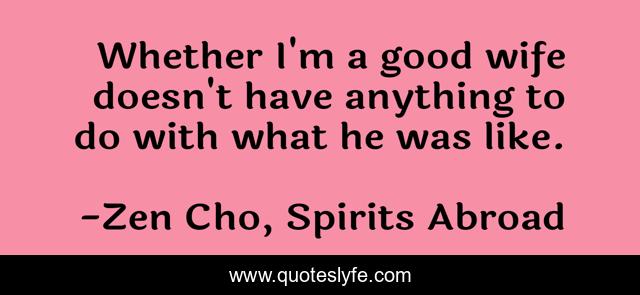 This page presents the quote "Whether I'm a good wife doesn't have anything to do with what he was like.". Author of this quote is Zen Cho, Spirits Abroad. This quote is about magic, spirits, myth, malaysia, supernatural, ghosts, legend,.