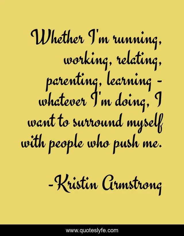 This page presents the quote "Whether I'm running, working, relating, parenting, learning - whatever I'm doing, I want to surround myself with people who push me.". Author of this quote is Kristin Armstrong. This quote is about me, myself, learning,.