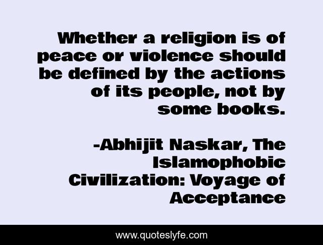 This page presents the quote "Whether a religion is of peace or violence should be defined by the actions of its people, not by some books.". Author of this quote is Abhijit Naskar, The Islamophobic Civilization: Voyage of Acceptance. This quote is about inspiring, peace, inspirational, religious-violence, positive, motivational, religion-and-philosophy, confidence, religious-tolerance,.