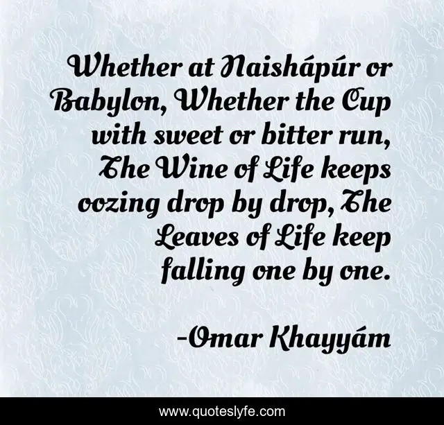 This page presents the quote "Whether at Naishápúr or Babylon, Whether the Cup with sweet or bitter run, The Wine of Life keeps oozing drop by drop, The Leaves of Life keep falling one by one.". Author of this quote is Omar Khayyám. .