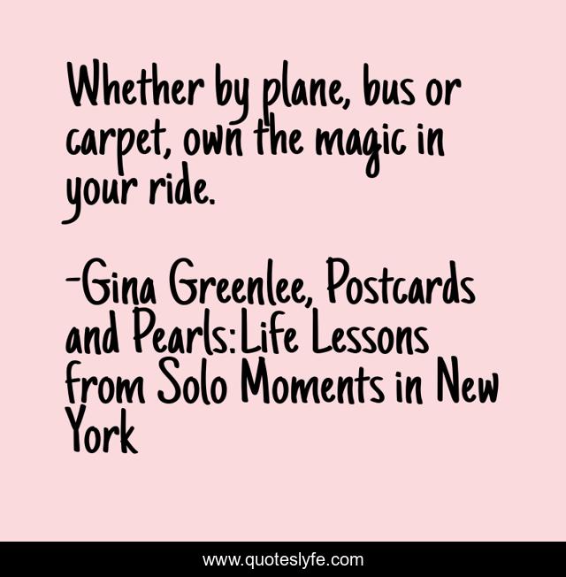 This page presents the quote "Whether by plane, bus or carpet, own the magic in your ride.". Author of this quote is Gina Greenlee, Postcards and Pearls:Life Lessons from Solo Moments in New York. This quote is about travel, new-york-city, new-york-travel, travel-writing, traveling,.