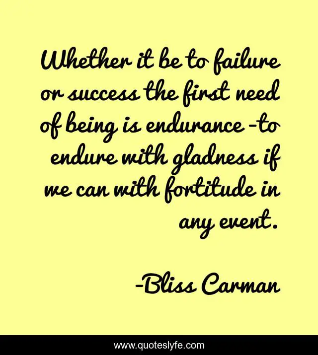 This page presents the quote "Whether it be to failure or success the first need of being is endurance -to endure with gladness if we can with fortitude in any event.". Author of this quote is Bliss Carman. This quote is about courage, bravery,.