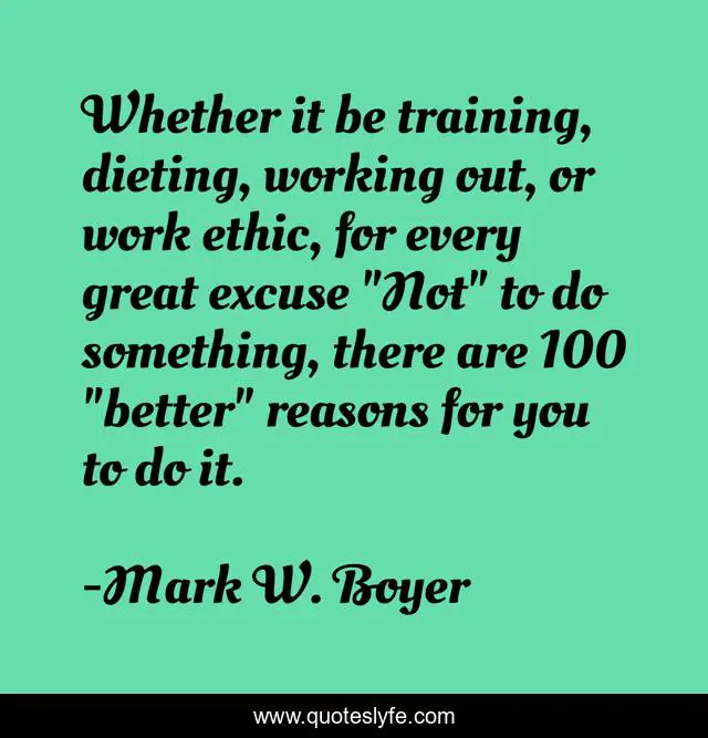 This page presents the quote "Whether it be training, dieting, working out, or work ethic, for every great excuse "Not" to do something, there are 100 "better" reasons for you to do it.". Author of this quote is Mark W. Boyer. This quote is about training, wisdom-inspirational, positive, motivational, confidence, work-ethic, mark-boyer, inspirational, enthusiasm,.