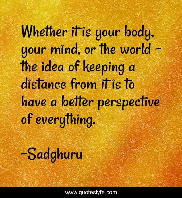 This page presents the quote "Whether it is your body, your mind, or the world – the idea of keeping a distance from it is to have a better perspective of everything.". Author of this quote is Sadghuru. This quote is about body, world, mind, ideas,.