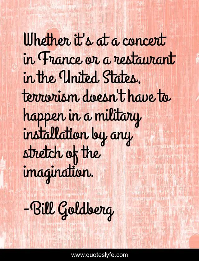 This page presents the quote "Whether it's at a concert in France or a restaurant in the United States, terrorism doesn't have to happen in a military installation by any stretch of the imagination.". Author of this quote is Bill Goldberg. This quote is about military, restaurant,.