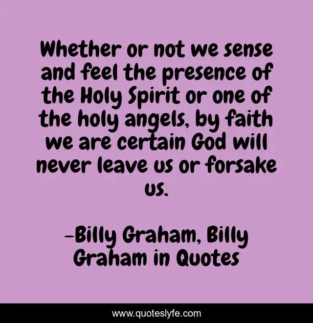 This page presents the quote "Whether or not we sense and feel the presence of the Holy Spirit or one of the holy angels, by faith we are certain God will never leave us or forsake us.". Author of this quote is Billy Graham, Billy Graham in Quotes. This quote is about angels, billy-graham,.