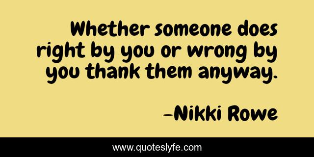 This page presents the quote "Whether someone does right by you or wrong by you thank them anyway.". Author of this quote is Nikki Rowe. This quote is about empowerment, move-on, quote, appreciate, life, self-worth, let-go, inspiration,.