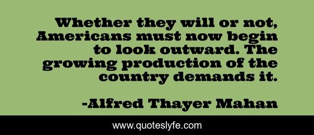 This page presents the quote "Whether they will or not, Americans must now begin to look outward. The growing production of the country demands it.". Author of this quote is Alfred Thayer Mahan. .