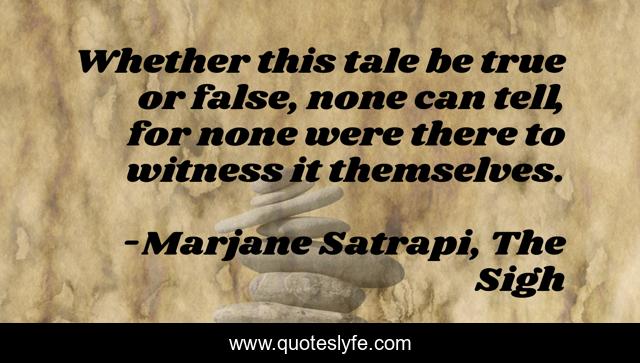 This page presents the quote "Whether this tale be true or false, none can tell, for none were there to witness it themselves.". Author of this quote is Marjane Satrapi, The Sigh. .