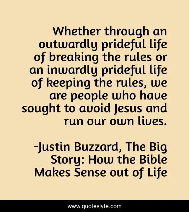 This page presents the quote "Whether through an outwardly prideful life of breaking the rules or an inwardly prideful life of keeping the rules, we are people who have sought to avoid Jesus and run our own lives.". Author of this quote is Justin Buzzard, The Big Story: How the Bible Makes Sense out of Life. This quote is about rules, pride, jesus,.