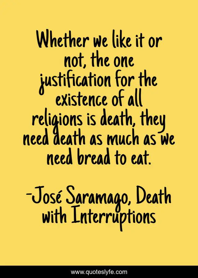 This page presents the quote "Whether we like it or not, the one justification for the existence of all religions is death, they need death as much as we need bread to eat.". Author of this quote is José Saramago, Death with Interruptions. This quote is about life, death, existentialism, religion, human, human-condition,.