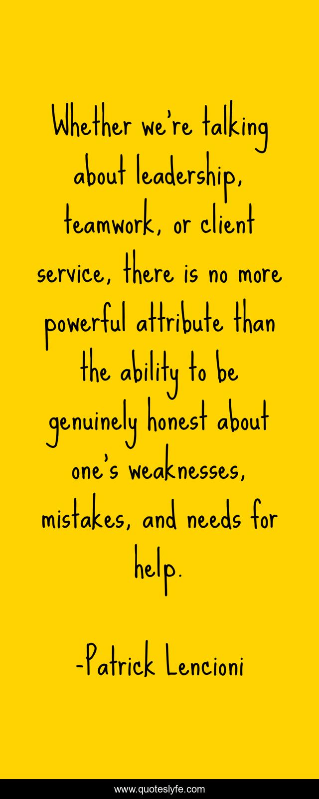 This page presents the quote "Whether we're talking about leadership, teamwork, or client service, there is no more powerful attribute than the ability to be genuinely honest about one's weaknesses, mistakes, and needs for help.". Author of this quote is Patrick Lencioni. This quote is about mistakes, teamwork, service,.