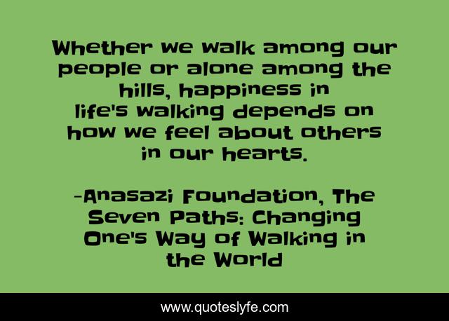 This page presents the quote "Whether we walk among our people or alone among the hills, happiness in life's walking depends on how we feel about others in our hearts.". Author of this quote is Anasazi Foundation, The Seven Paths: Changing One's Way of Walking in the World. This quote is about anasazi-foundation, mother-earth, nature, native-american, wisdom, healing, native-american-wisdom, anasazi,.