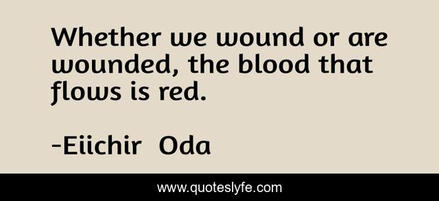 This page presents the quote "Whether we wound or are wounded, the blood that flows is red.". Author of this quote is Eiichirō Oda. This quote is about one-piece, respect, pirates, hope,.