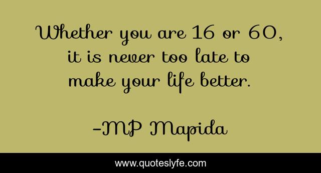 This page presents the quote "Whether you are 16 or 60, it is never too late to make your life better.". Author of this quote is MP Mapida. This quote is about positive, confidence, motivational, optimistic,.