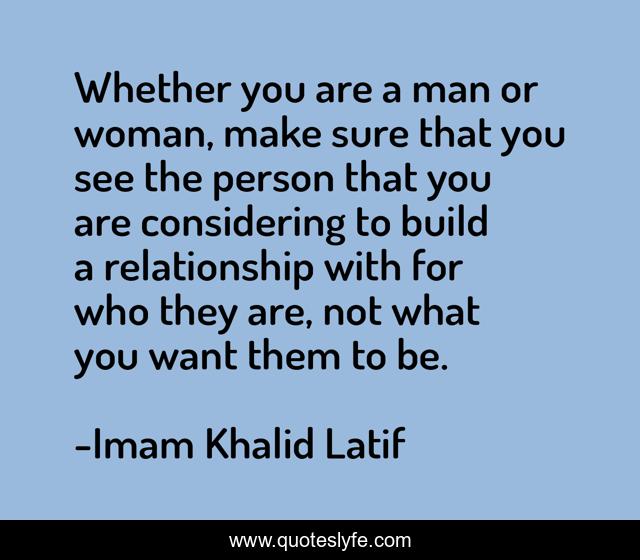 This page presents the quote "Whether you are a man or woman, make sure that you see the person that you are considering to build a relationship with for who they are, not what you want them to be.". Author of this quote is Imam Khalid Latif. .