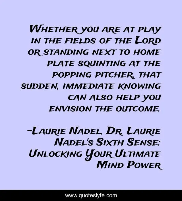 This page presents the quote "Whether you are at play in the fields of the Lord or standing next to home plate squinting at the popping pitcher, that sudden, immediate knowing can also help you envision the outcome.". Author of this quote is Laurie Nadel, Dr. Laurie Nadel's Sixth Sense: Unlocking Your Ultimate Mind Power. This quote is about intuition, envision, power-of-thoughts, quote-of-the-day, aurie-nadel, dan-rather, wayne-dyer, inspirational, quote-about-life,.