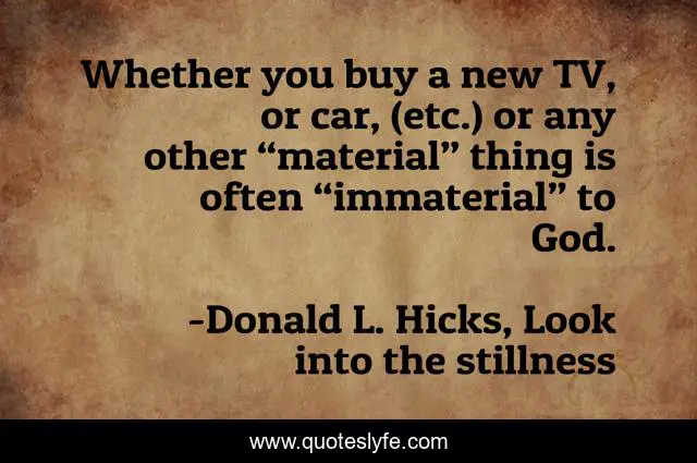 This page presents the quote "Whether you buy a new TV, or car, (etc.) or any other “material” thing is often “immaterial” to God.". Author of this quote is Donald L. Hicks, Look into the stillness. This quote is about god, materialism, materialistic, possessiveness,.