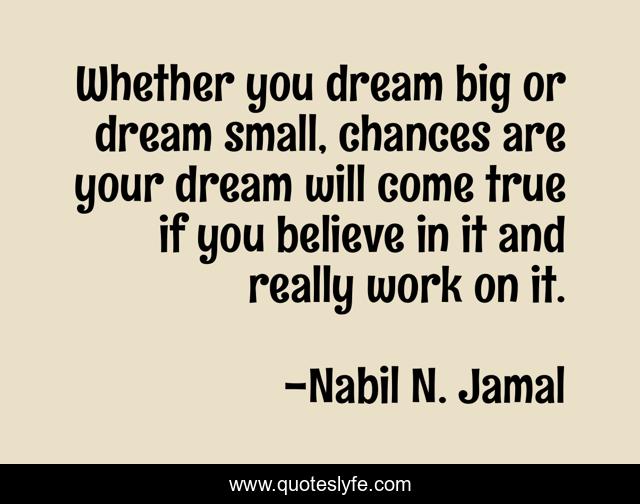 This page presents the quote "Whether you dream big or dream small, chances are your dream will come true if you believe in it and really work on it.". Author of this quote is Nabil N. Jamal. This quote is about motivation, nabil-n-jamal, big, work, behaviour, attitude, dreams, inspirational, nabil-jamal,.