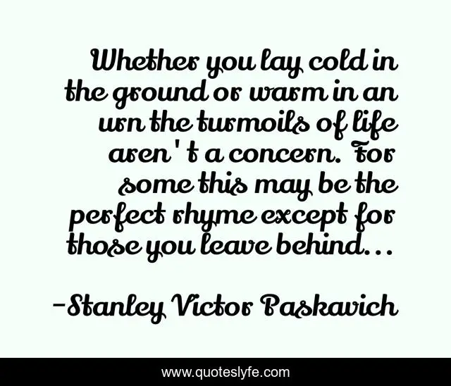 This page presents the quote "Whether you lay cold in the ground or warm in an urn the turmoils of life aren't a concern. For some this may be the perfect rhyme except for those you leave behind...". Author of this quote is Stanley Victor Paskavich. This quote is about burial, life, death, belief, funeral, religion, suicide,.