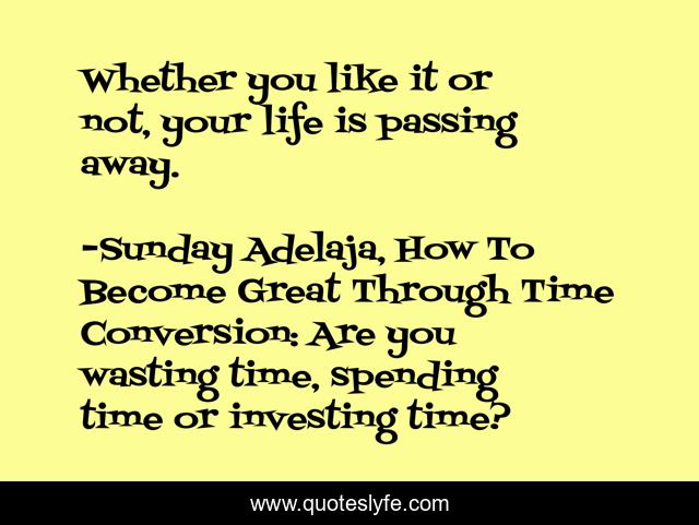 This page presents the quote "Whether you like it or not, your life is passing away.". Author of this quote is Sunday Adelaja, How To Become Great Through Time Conversion: Are you wasting time, spending time or investing time?. This quote is about great, productivity, wealth, gift, purpose, work, life, convert, value,.