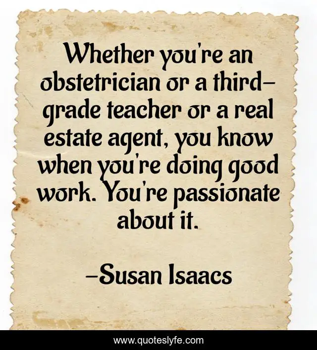 This page presents the quote "Whether you're an obstetrician or a third-grade teacher or a real estate agent, you know when you're doing good work. You're passionate about it.". Author of this quote is Susan Isaacs. This quote is about work, good, real estate,.
