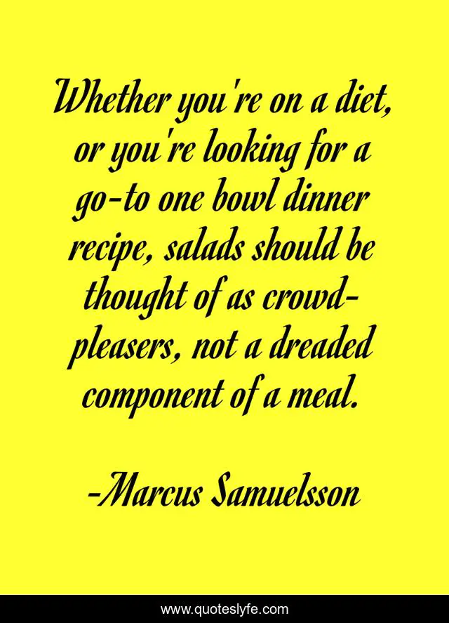 This page presents the quote "Whether you're on a diet, or you're looking for a go-to one bowl dinner recipe, salads should be thought of as crowd-pleasers, not a dreaded component of a meal.". Author of this quote is Marcus Samuelsson. This quote is about thought, looking, dinner,.