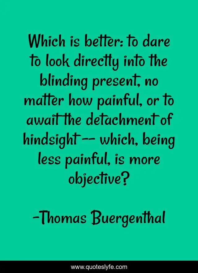 This page presents the quote "Which is better: to dare to look directly into the blinding present, no matter how painful, or to await the detachment of hindsight -- which, being less painful, is more objective?". Author of this quote is Thomas Buergenthal. .
