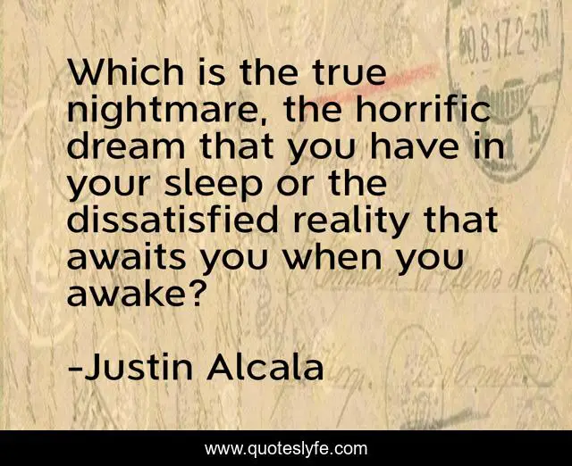 This page presents the quote "Which is the true nightmare, the horrific dream that you have in your sleep or the dissatisfied reality that awaits you when you awake?". Author of this quote is Justin Alcala. This quote is about reality-of-life, life-lessons, horror, nightmares, nightmares-fear, authors,.